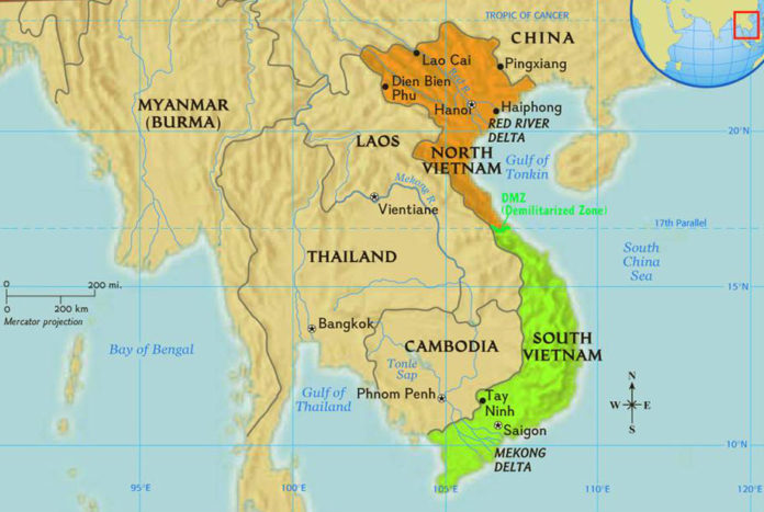 Cờ Việt Nam Dân chủ Cộng hoà và Việt Nam Cộng hoà tại vĩ tuyến 17 trong thời kỳ chiến tranh. Ảnh: Tạp chí Life.