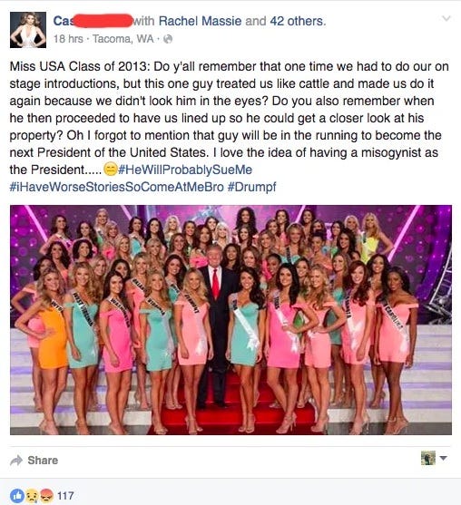 “Mr. Trump just barged right in, didn’t say anything, stood there and stared at us. He didn’t walk in and say, ‘Oh, I’m so sorry, I was looking for someone.’ He walked in, he stood and he stared. He was doing it because he knew that he could.” – Anonymous Miss USA Contestant