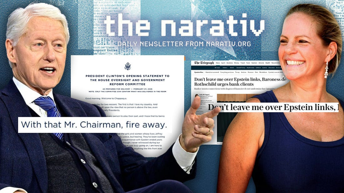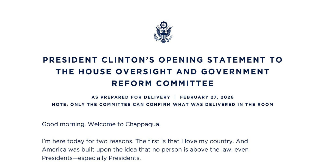 Bill Clinton hiện đang ngồi tại Chappaqua – cựu tổng thống đầu tiên ra làm chứng trước Quốc hội trong hơn 40 năm. Lời khai mở đầu của ông: “Tôi không thấy gì cả, và tôi không làm gì sai.” Ông sẽ liên tục viện dẫn chứng mất trí nhớ – “bị ràng buộc bởi lời thề không được suy đoán hay phỏng đoán.” Dấu hiệu rõ ràng nhất là những gì ông đã chủ động bảo vệ: 27 chuyến bay trên máy bay của Epstein, 17 lần Epstein đến thăm Nhà Trắng dưới thời Clinton. Hillary đã né tránh hàng tá câu hỏi cho ông hôm qua trong suốt sáu giờ làm chứng, bao gồm tất cả mọi thứ về mối liên hệ giữa Sáng kiến Toàn cầu Clinton và Epstein. Trong khi đó, hàng chục hồ sơ phỏng vấn của FBI về một phụ nữ cáo buộc Trump tấn công tình dục cô khi mới 13 tuổi được xác nhận là đã biến mất khỏi hồ sơ Epstein do Bộ Tư pháp công bố. FBI đã phỏng vấn cô bốn lần vào năm 2019. Ba bản tóm tắt đã biến mất. Chủ tịch đảng Cộng hòa Comer đã cùng với các đảng viên Dân chủ yêu cầu câu trả lời. Một tổng thống ra làm chứng. Bộ Tư pháp của tổng thống kia lại xóa sạch hồ sơ của ông ta.