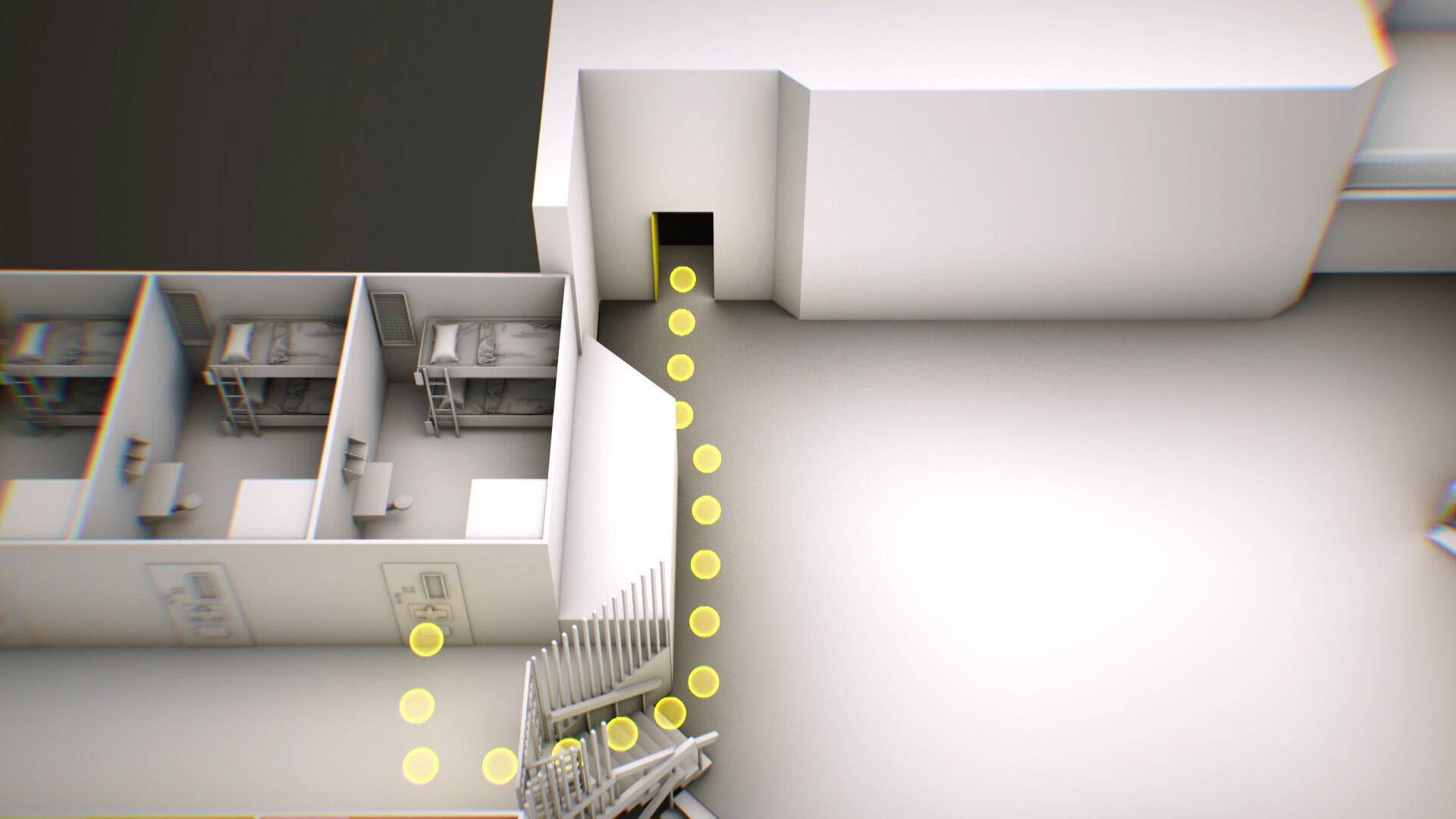 Mặc dù thỉnh thoảng có thể thấy chuyển động ngắn trên cầu thang khi ai đó đi lên từ phía bên trái, nhưng khu vực này hầu như bị che khuất trong suốt đoạn video, khiến không thể xác định liệu có ai đó đã vào khu biệt giam thông qua lối vào chính và tiếp cận cầu thang mà không bị camera ghi lại hay không.