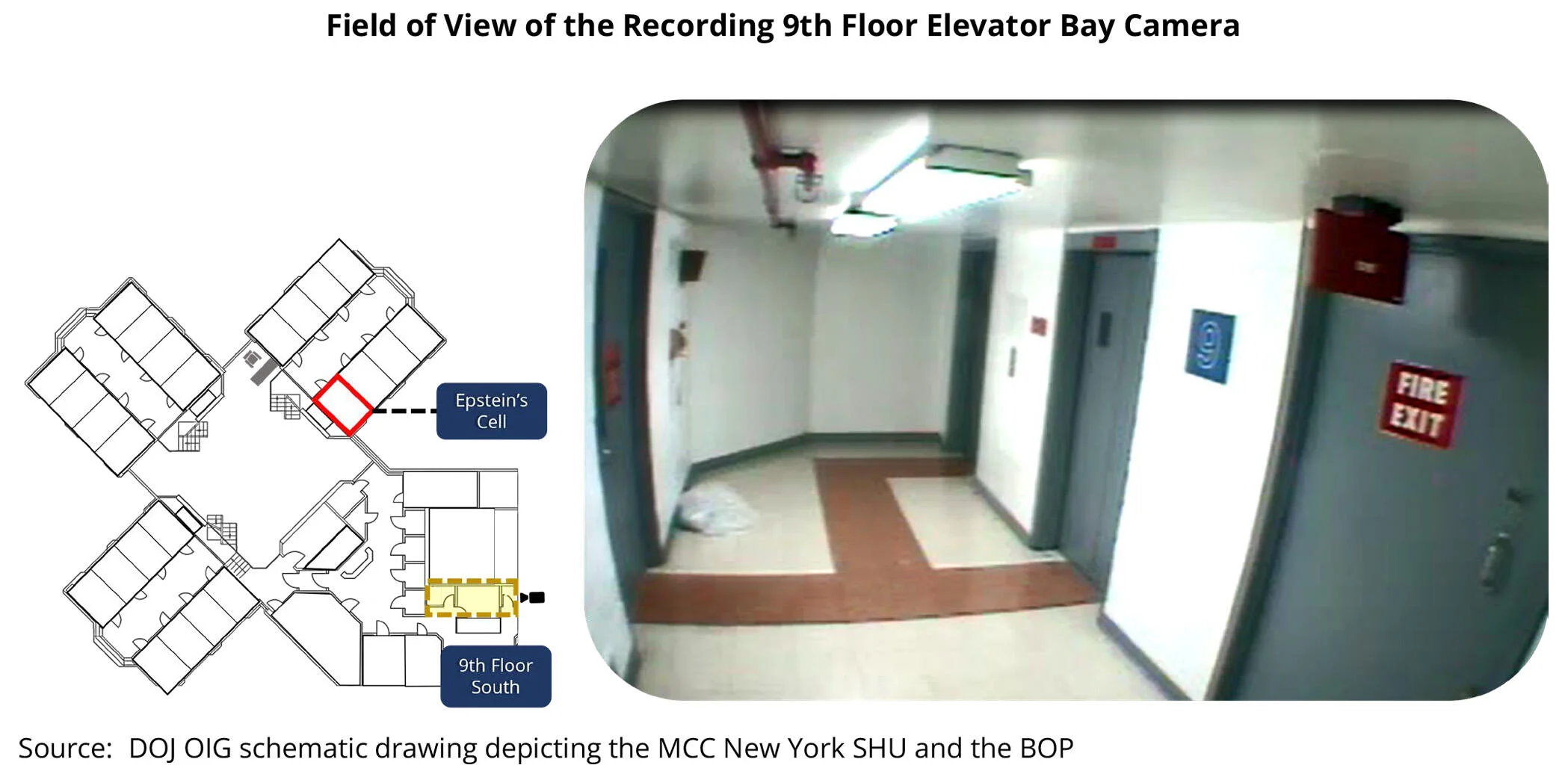 Ngoài những camera không ghi lại được các góc quay khác của khu vực sinh hoạt chung của khu biệt giam SHU, báo cáo của tổng thanh tra cho biết còn có hai camera khác ghi lại các sự kiện ở khu vực gần phòng giam của Epstein — một camera ghi hình khu vực thang máy dùng để vận chuyển tù nhân và một camera khác tập trung vào bàn trực của lính canh gần đó.