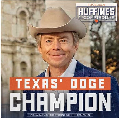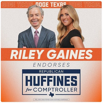 Trước khi mua bất động sản này tại cuộc đấu giá (với số tiền không được tiết lộ) vào năm 2023, Huffines đã tranh cử chức Thống đốc Texas với tư cách là một thành viên của phong trào Tea Party thuộc đảng Cộng hòa, tập trung vào quyền cá nhân, kiềm chế chi tiêu, trách nhiệm cá nhân, chính phủ hạn chế và chủ nghĩa bảo thủ xã hội. Ông nổi tiếng với việc viết các bài bình luận trên tờHouston Chronicle và Dallas Morning News , tập trung vào thuế bất động sản, và ông kịch liệt phản đối các chính sách của Greg Abbott về việc phong tỏa do COVID-19 và việc thúc đẩy yếu kém các chính sách về người chuyển giới dành cho thanh thiếu niên Texas. Ông cho rằng quan điểm của Abbott quá tự do và đã sử dụng câu chuyện của Riley Gaines – một cựu vận động viên bơi lội đại học từng phản đối việc cho phép vận động viên chuyển giới tham gia thể thao – như một phần trong chiến dịch tranh cử của mình, cùng với việc bãi bỏ thuế bất động sản, đóng cửa biên giới và chấm dứt phá thai.