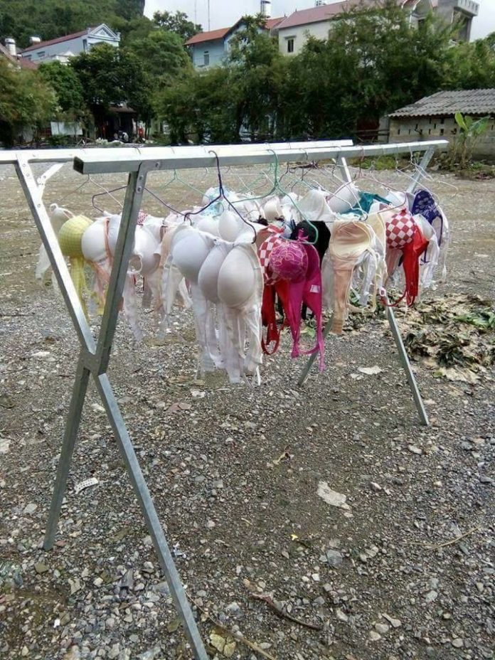 Nhà toàn đàn bà con gái, nên cái dây phơi, dài từ đầu đến cuối sân, lúc nào cũng lủng lẳng toàn xì-líp với coóc-sê, hồng đỏ xanh vàng, đủ cả! Nhiều khi vội đi, không để ý, bị xì-líp nó đập vào mặt, coóc-sê nó quấn quanh đầu. Rồi những khi rầu rầu, bên ấm trà tầu, nhìn cái mớ xì-líp coóc-sê ấy phất phơ theo gió hiu hiu, hệt như những chiếc lá bàng già nua lay lắt trên những cành khô gầy guộc khẳng khiu trong buổi chiều đông giá rét… Buồn chẳng để đâu cho hết…
