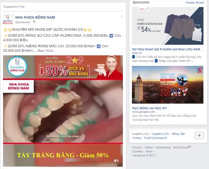 Một loại doanh nghiệp rất khó cấm quảng cáo trên facebook, đó là các công ty, phòng khám y tế. Những lợi thế truyền thông do mạng xã hội mang lại quá lớn, các phòng khám đặt trên lãnh thổ Việt Nam cũng phải tranh thủ lợi thế này, chi kha khá tiền cho hoạt động quảng cáo. Chẳng hạn phòng khám nha khoa Phong Nam sau đây, ảnh chụp màn hình tháng 8 năm 2017.