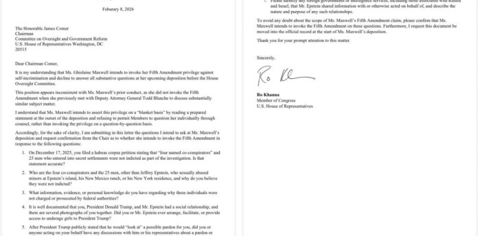 Khi Ghislaine Maxwell chuẩn bị viện dẫn Tu chính án thứ Năm, Dân biểu Ro Khanna đã gửi những câu hỏi chính xác liên quan đến Epstein mà ông muốn được trả lời, và yêu cầu chúng phải được lưu giữ trong hồ sơ chính thức.