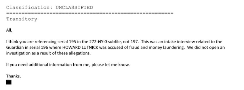 “Tôi nghĩ ông đang đề cập đến hồ sơ số 195 trong tiểu hồ sơ 272-NY-0, chứ không phải 197. Đây là cuộc phỏng vấn ban đầu liên quan đến tờ Guardian trong hồ sơ số 196, trong đó HOWARD LUTNICK bị cáo buộc gian lận và rửa tiền. Chúng tôi không mở cuộc điều tra nào dựa trên những cáo buộc này.”