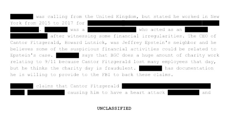Người gọi điện cho biết anh ta từng làm việc tại New York từ năm 2015 đến 2017 cho Cantor Fitzgerald và công ty con BGC Partners. Anh ta nói với FBI rằng Howard Lutnick, Giám đốc điều hành của Cantor Fitzgerald, là hàng xóm của Jeffrey Epstein và “có thể có liên hệ với Jeffrey Epstein”. Anh ta cho biết đã chứng kiến ”những bất thường về tài chính” và tin rằng “một số hoạt động tài chính đáng ngờ có thể liên quan đến vụ án của Epstein”.