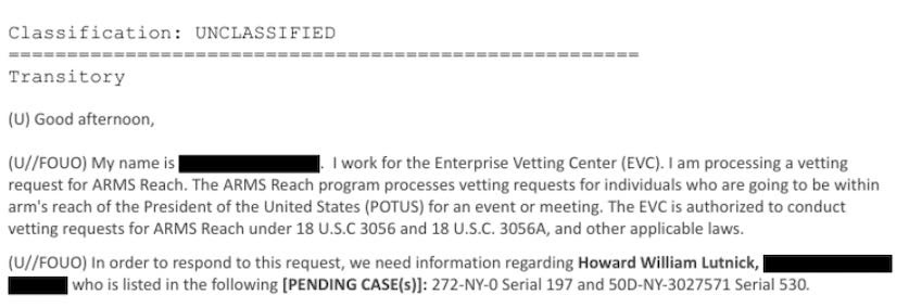 Việc kiểm tra an ninh là một phần của chương trình có tên ARMS Reach — quy trình của FBI và Cơ quan Mật vụ để sàng lọc bất kỳ ai sẽ tiếp xúc trực tiếp với Tổng thống Hoa Kỳ. Trung tâm Sàng lọc Doanh nghiệp của FBI tiến hành kiểm tra theo các đạo luật liên bang về bảo vệ tổng thống. Đây không phải là một cuộc kiểm tra lý lịch thông thường. Đó là một cuộc sàng lọc an ninh quốc gia để được phép tiếp cận Tổng thống.