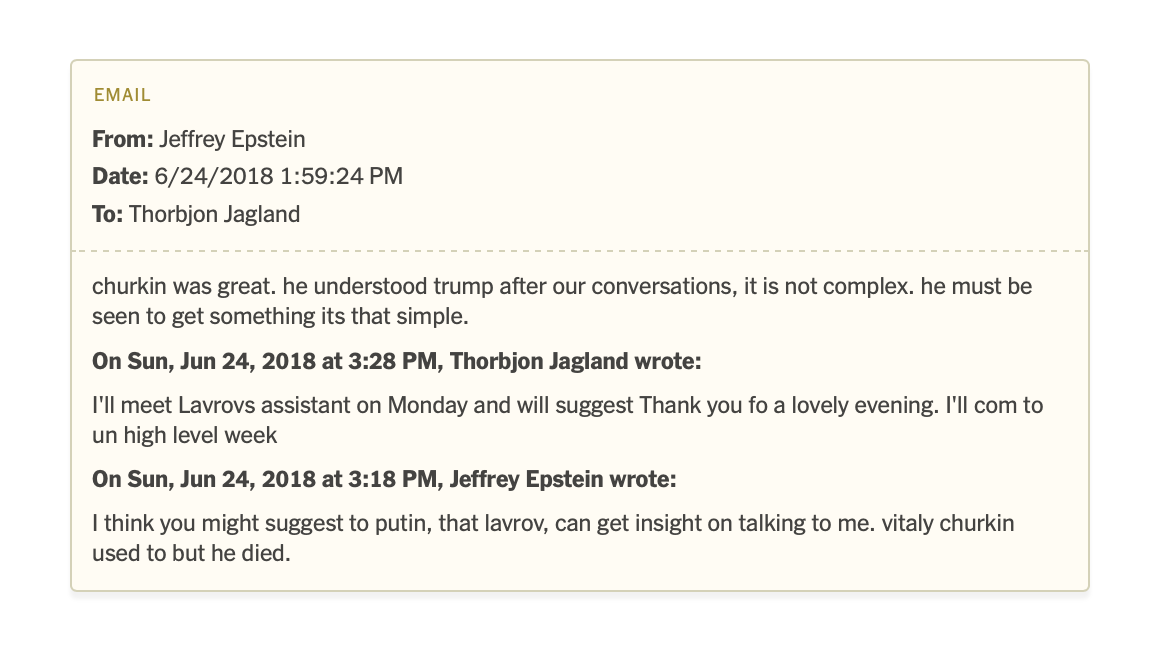 Một email được công bố hôm nay cho thấy Jeffrey Epstein đã gợi ý với một quan chức cấp cao của châu Âu, Thorbjorn Jagland, rằng Tổng thống Nga Vladimir V. Putin và Ngoại trưởng Sergei Lavrov có thể “hiểu rõ” Tổng thống Trump bằng cách nói chuyện với ông. Email này được viết cho Jagland vào tháng 6 năm 2018, một tháng trước khi Trump gặp Putin tại Helsinki, Phần Lan.