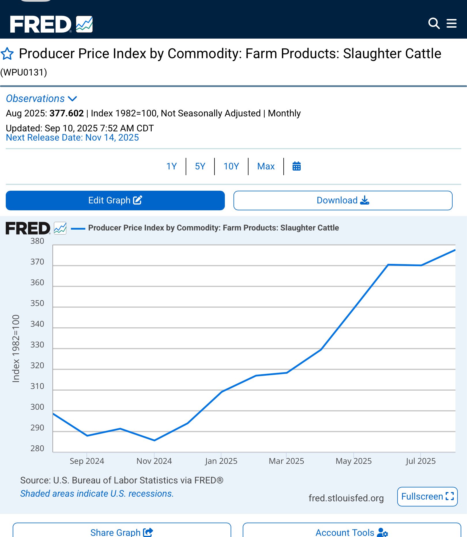 Theo dữ liệu từ FRED (Federal Reserve Economic Data), chỉ số Producer Price Index for Slaughter Cattle — tức giá bò hơi mà nông dân bán cho nhà máy giết mổ — đã tăng liên tục suốt một năm qua, từ mức khoảng 285 lên 377 điểm (chỉ trong 10 tháng, tương đương tăng hơn 30%).