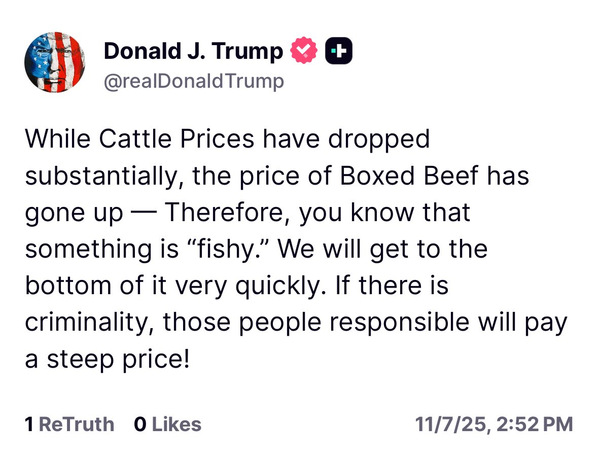 Trump viết rằng “giá bò giảm, nhưng giá thịt bò hộp lại tăng” và gọi đó là “fishy”.