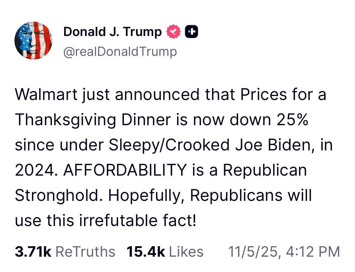 “Walmart vừa công bố giá bữa tối Thanksgiving giảm 25% so với thời Sleepy/Crooked Joe Biden năm 2024. AFFORDABILITY là thành trì của Đảng Cộng hòa!”