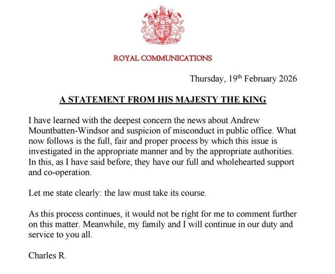 Tuyên bố duy nhất của nhà vua là sự xác nhận công khai về một sự chuyển giao quyền lực riêng tư — ông ta không gọi em trai mình là người thân mà gọi là “Andrew Mountbatten-Windsor”, tuyên bố “luật pháp phải được thực thi”, và ký tên là “Charles R.” — không phải là bệ hạ — thậm chí không phải là Quốc vương. “Gia đình hoàng gia sẽ không bị bắt nếu nhà vua không muốn họ bị bắt”, Shalev nói. “Ông ấy đã để chuyện này xảy ra.” William và Kate đang xây dựng lại chế độ quân chủ bằng cách đốt cháy những phần tồi tệ nhất của nó — và ngọn lửa đó giờ đây có thể nhìn thấy từ Washington.