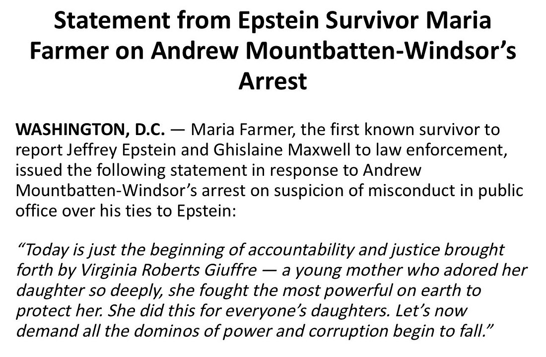 Maria Farmer, người sống sót đầu tiên được biết đến đã tố cáo Jeffrey Epstein và Ghislaine Maxwell với cơ quan thực thi pháp luật, đã đưa ra một tuyên bố: “Hôm nay chỉ là sự khởi đầu của trách nhiệm giải trình và công lý do Virginia Roberts Giuffre mang lại — một người mẹ trẻ yêu thương con gái mình sâu sắc, bà đã chiến đấu chống lại những kẻ quyền lực nhất trên trái đất để bảo vệ con gái mình. Bà ấy đã làm điều này vì con gái của tất cả mọi người. Giờ đây, chúng ta hãy yêu cầu tất cả các quân cờ domino của quyền lực và tham nhũng bắt đầu sụp đổ.” Lev Parnas, người từng sống trong thế giới đang được phơi bày, gọi vụ bắt giữ này là sự giải trình thực sự đầu tiên vượt ra ngoài phạm vi của chính Epstein và Maxwell. “Nếu ngay cả anh trai ruột của nhà vua, máu mủ của ông ta, cũng được phép đứng trước công lý, điều đó sẽ buộc Tổng thống Trump phải làm điều tương tự — mở tất cả các hồ sơ, bỏ che giấu tất cả những thông tin, ngay cả khi đó là Howard Lutnick, ngay cả khi đó là người thân cận với ông ấy.”