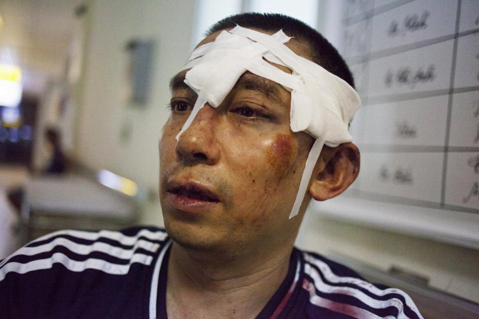In this picture taken on July 10, 2016, anti-China activist La Viet Dung is seen while under medical care at a local hospital in Hanoi. A prominent Vietnamese activist who plays in a football team that doubles up as an anti-China protest group said July 11 he was viciously beaten by plainclothes thugs after a match. (Photo credit should read DOAN BAO CHAU/AFP/Getty Images)