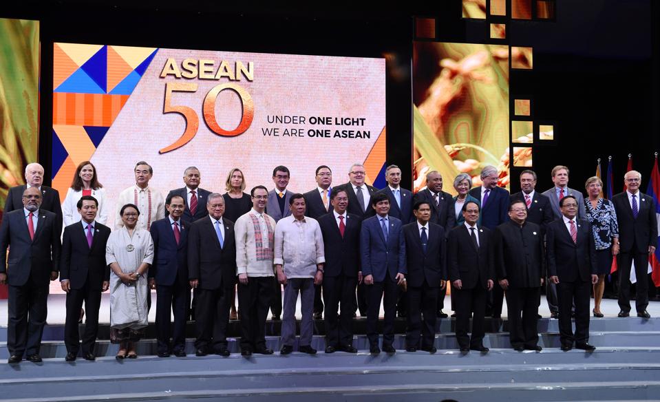 Southeast Asian and invited foreign ministers pose for a group photo during the closing ceremony of the 50th Association of Southeast Asian Nations (ASEAN) regional security forum in Manila on August 8, 2017. (TED ALJIBE/AFP/Getty Images)