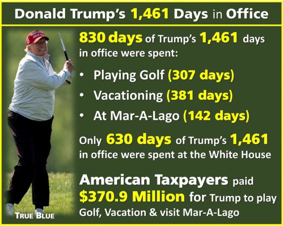 Người ta thường nói “nghỉ ngơi cũng là để làm việc tốt hơn,” nhưng trong trường hợp này, dường như “làm việc” chỉ là để nghỉ ngơi nhiều hơn. Tổng chi phí mà người đóng thuế Mỹ phải trả cho các chuyến golf, kỳ nghỉ và bảo vệ tổng thống tại các khu nghỉ dưỡng riêng của ông được ước tính lên tới hơn 370 triệu đô la. Đó là số tiền đủ để xây thêm hàng chục trường học, hoặc tài trợ bữa ăn trưa miễn phí cho hàng triệu học sinh nghèo.