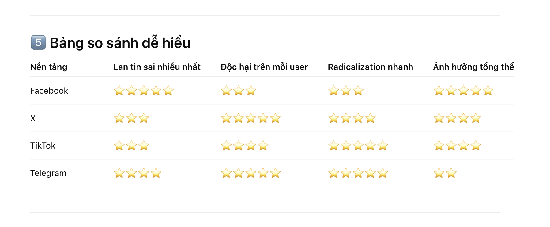 Ngoài ra, Telegram là nơi có tỷ lệ nội dung hận thù công khai cao nhất. Tuy nhiên, do số lượng người dùng thấp hơn và tính chất cộng đồng khép kín, ảnh hưởng của Telegram mang tính tập trung hơn là đại chúng. Nó thường đóng vai trò như “phòng chiến lược” cho các mạng lưới tuyên truyền, thay vì là nơi tạo dư luận xã hội rộng rãi.