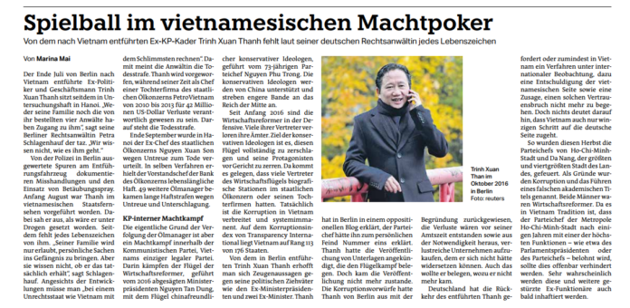 Trên tờ nhật báo TAZ của Đức, số ra hôm nay ngày 16.10.2017 có đăng một bài báo về Trịnh Xuân Thanh với tựa đề “Con tốt trong ván cờ quyền lực ở Việt Nam” của nữ ký giả Marina Mai. Sau đây là bản dịch bài báo: