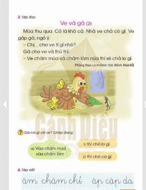 Tiếng Việt 1 – bộ Cánh Diều lại xào xáo những “con tương cận” thành những “con cận chiến” (còn gọi là thiên địch) như ve với gà, quạ và chó! Cái tương phản “một mất một còn” giữa 2 con không thể làm nên một ngụ ngôn đạo đức!
