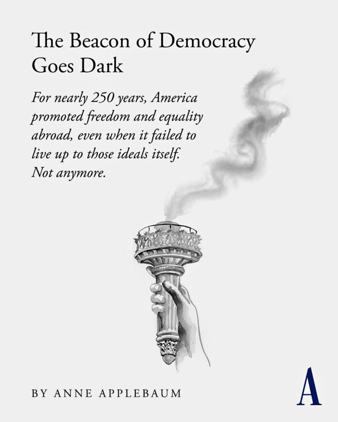 Sự chuyển hướng chống lại các thể chế vốn mang tính lưỡng đảng, chống lại niềm tin rằng người Mỹ nên bảo vệ và thúc đẩy nền dân chủ trên toàn thế giới, và chống lại chính niềm tin vào dân chủ, là một phần của điều gì đó rộng lớn hơn. Chúng ta có một tổng thống thường xuyên tấn công các thẩm phán và nhà báo, người bắt nạt các CEO buộc họ phải giao nộp cổ phần trong công ty của mình và các hiệu trưởng đại học buộc họ phải trả những khoản tiền phạt vô căn cứ, người điều động quân đội vào các thành phố của Mỹ, người đang xây dựng một hình thức cảnh sát nội địa mới, và người công khai khuyến khích sự chia rẽ ngày càng sâu sắc giữa nước Mỹ “đỏ” và “xanh”. Ở nước ngoài, Donald Trump dường như hài lòng hơn với các nhà độc tài hơn là với các đồng minh dân chủ. Thuế quan trừng phạt tùy tiện của ông đã đẩy Lesotho, một quốc gia nhỏ ở châu Phi, vào tình trạng suy thoái kinh tế. Yêu cầu chiếm đóng Greenland của ông đã tạo ra một cuộc khủng hoảng chính trị ở Đan Mạch, một đồng minh lâu năm của Mỹ.