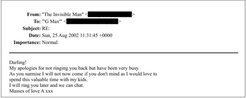 PA: Maxwell thân mến! Anh đã ở đâu và làm gì trong thời gian qua? Gần đây anh không hề liên lạc với em và em lo lắng anh đang trở nên khép kín! Em rất muốn được đi khỏi đây, nhưng với cuộc chiến này, giới truyền thông sẽ phát cuồng nếu người ta biết em đang ở nước ngoài trong thời gian này. Em đang cảm thấy bực bội vì bị giam cầm như thế này! Em vừa mới cho các con gái đi nghỉ với mẹ chúng vài tuần và em đã lên kế hoạch dành thời gian với chúng ở ngoài nhưng giờ hoàn cảnh buộc em phải ở đây nên em ‘ở nhà một mình’ vài tuần! Dù sao thì, gửi anh thật nhiều tình yêu và hy vọng sớm gặp lại anh! A (bực bội) xxx