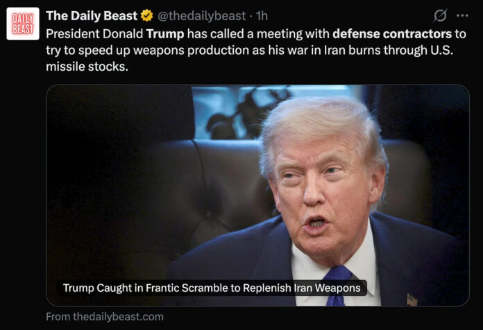 Trên trang Truth Social, Trump đảm bảo với người dân Mỹ rằng tình hình vũ khí là “gần như không giới hạn”. Chính Ngoại trưởng của ông lại nói điều ngược lại trước Quốc hội. Chủ tịch Hội đồng Tham mưu trưởng Liên quân cũng đã cảnh báo ông thẳng thừng không nên làm vậy. Các tướng lĩnh của ông đang theo dõi số lượng đạn dược bị đánh chặn tăng lên và lượng đạn dự trữ giảm xuống, chỉ sau năm ngày chiến tranh lẽ ra chỉ kéo dài “bốn đến năm tuần”.
