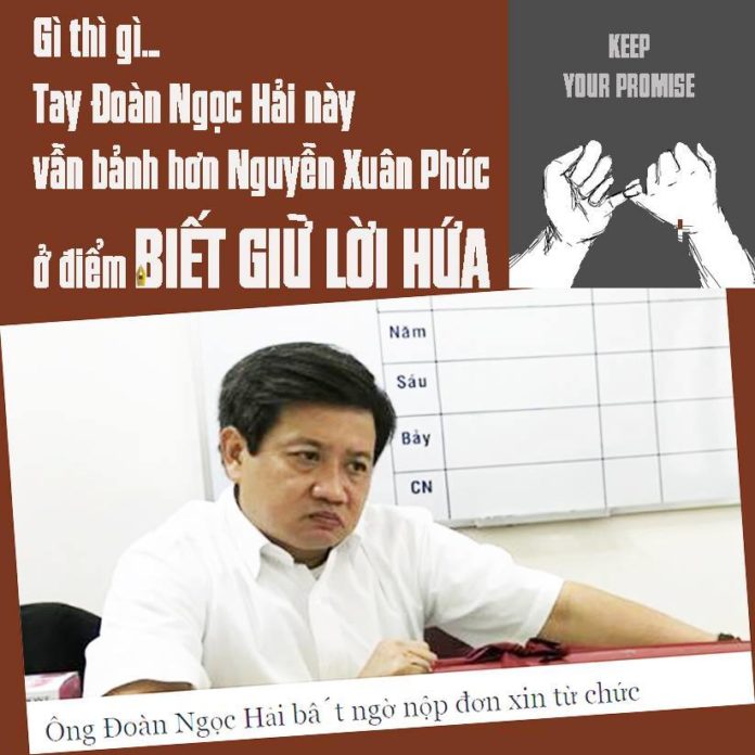 Trước tiên phải nhìn nhận, nhất là trong bối cảnh nhiễu nhương của đất nước dưới sự lãnh đạo của tập đoàn CSVN vô liêm sỉ, là những người giữ được lời hứa thật hiếm hoi. Hành động từ chức của ông Đoàn Ngọc Hải, tuy rằng làm không thành công, thậm chí bị chỉ trích nặng nề về phương cách thực hiện, xứng đáng được nhận cái vỗ tay khen thưởng vì còn chút khí khái chứ không như ông cựu Thủ Tướng Nguyễn Tấn Dũng mặt dầy, và hàng vạn cán bộ CSVN khác, ăn hại, phá tan hoang đất nước mà vẫn nhục nhã cố đấm ăn xôi, dán đít vào ghế không hề biết từ chức.