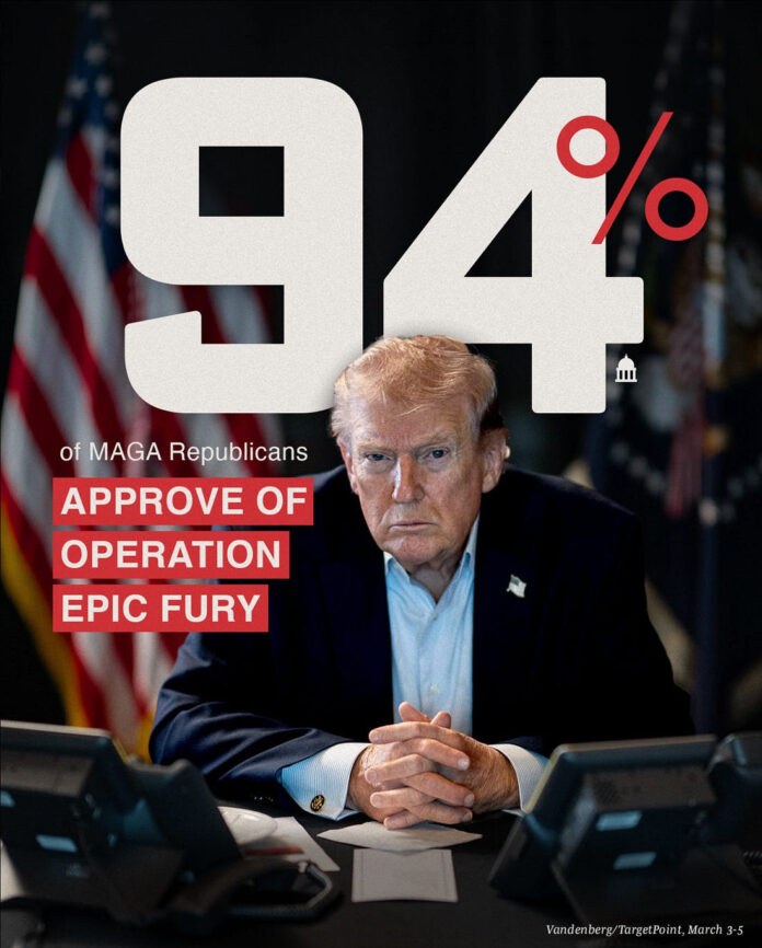 Con số 94% đó đến từ một cuộc thăm dò do TargetPoint Consulting — một công ty nghiên cứu đối lập và chiến lược chính trị của đảng Cộng hòa — thực hiện, được trích dẫn trong một bài báo trên Wall Street Journal của Vandenberg Coalition, một tổ chức tư vấn ủng hộ can thiệp quân sự theo đường lối diều hâu. Con số này đề cập cụ thể đến những cử tri tự nhận mình là người ủng hộ MAGA , chứ không phải toàn thể công chúng Mỹ. Ngay cả trong cùng cuộc thăm dò đó, chỉ có 84% cử tri của Trump ủng hộ rộng rãi cuộc chiến.
