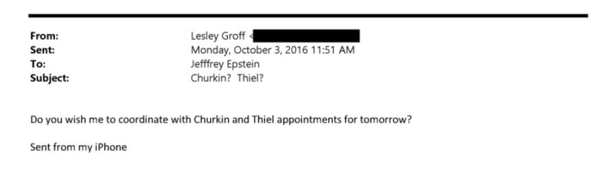 Ngày 3 tháng 10 năm 2016, Lesley Groff, trợ lý của Jeffrey Epstein, đã gửi cho ông một email lên lịch hẹn. Tiêu đề email: “Churkin? Thiel?”