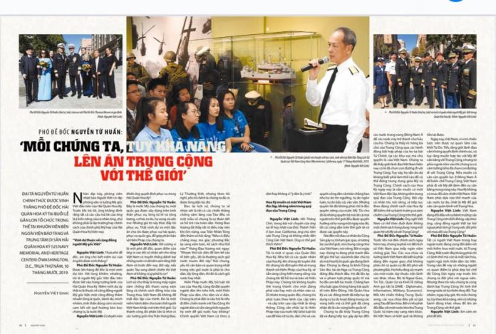 SAN JOSE, California (NV) – Ngày 21 Tháng Chín vừa qua, nhân lễ huý nhật của Đức Thánh Trần, Phó Đề Đốc Nguyễn Từ Huấn, vị tướng Hải Quân Mỹ gốc Việt đầu tiên đã được Hội Hải Quân Bạch Đằng mời đến nói chuyện tại San Jose. Bài ấy đã gây chú ý không ít thì nhiều của nhiều người ở hải ngoại và cũng như ở Việt Nam. Ông Huấn đã phóng tác để hiện đại hoá hịch tướng sĩ của Đức Thánh Trần, bằng cách dùng thí dụ và thời sự của ngày nay để mang đến thông điệp nói đến nguy biến mất nước của Việt Nam từ Tầu Cộng. Trong dịp đến dự lễ lên lon của Phó Đề Đốc Huấn, tôi đã có dịp ngồi xuống đàm thoại với Ông Huấn tại tư gia của một cựu Đại Tá Hải Quân Hoa Kỳ, người anh em kết nghĩa của Ông Huấn, khi họ phục vụ với nhau tại chiến trường Irak và A Phú Hãn vào năm 2005 – 2006. Giữa những ly rượu mừng của các đồng đội, tôi đã hỏi một số các câu hỏi có liên quan đến buổi nói chuyện của Ông Huấn tại San Jose. Trước khi trả lời, Ông Huấn khẳng định rằng tất cả các câu trả lời dưới đây là ý kiến riêng của ông ta chứ không phải là lập trường hay chính sách của chính phủ Mỹ hay của Hải Quân Hoa Kỳ hiện nay.