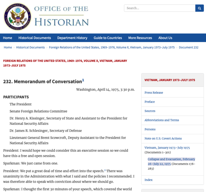 Tôi cũng đã tìm thấy trong kho hồ sơ lịch sử đã được giải mật của Bộ Ngoại Giao Hoa Kỳ một tài liệu về buổi họp vào ngày 14-4-1975 tại Tòa Bạch Cung giữa Tổng Thống Gerald Ford, Ngoại Trưởng Henry Kissinger, Bộ Trưởng Quốc Phòng James R. Schlesinger và Ủy Ban Ngoại Giao Thượng Viện trong đó có Nghị Sị Joe Biden và một số viên chức cao cấp trong chính quyền.