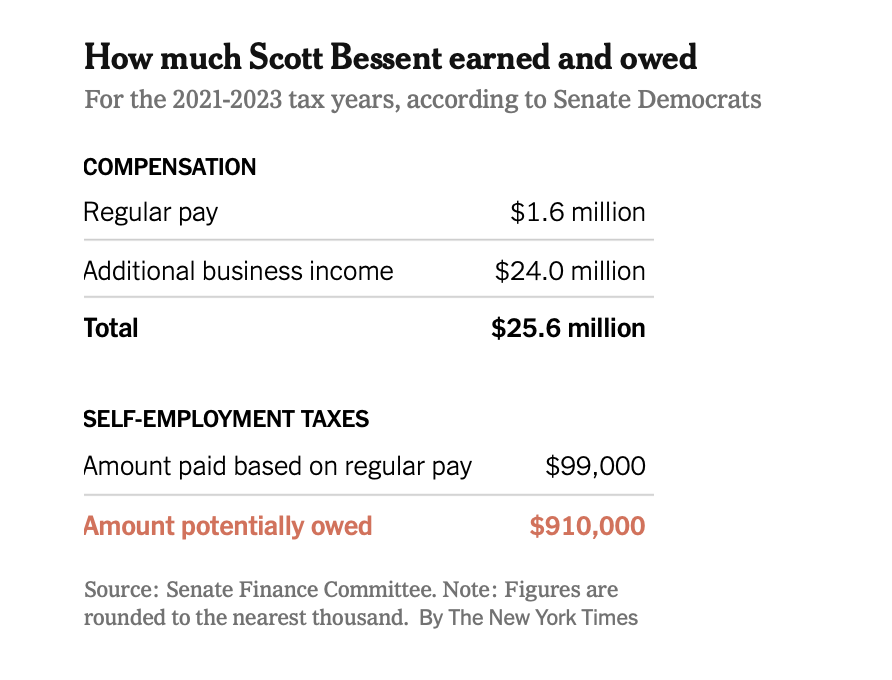 Trong ba năm được các nhân viên Đảng Dân chủ tại Thượng viện xem xét – 2021, 2022 và 2023 – ông Bessent đã trốn thuế tương tự như cách các chủ sở hữu của Soroban. Trong số khoảng 25,6 triệu đô la ông kiếm được trong những năm đó, 1,6 triệu đô la được thanh toán dưới hình thức “khoản thanh toán được đảm bảo”, loại khoản thanh toán mà luật liên bang quy định rõ ràng là phải chịu thuế tự doanh.