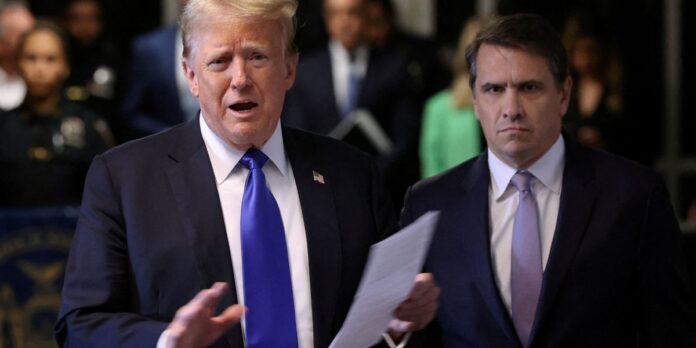 Cựu Tổng thống Hoa Kỳ Donald Trump, cùng với luật sư Todd Blanche, phát biểu với giới truyền thông khi ông đến tham dự phiên tòa hình sự về cáo buộc che giấu các khoản tiền bịt miệng tại Tòa án Hình sự Manhattan vào ngày 30 tháng 5 năm 2024 tại Thành phố New York. Michael M. Santiago/Pool qua REUTERS/