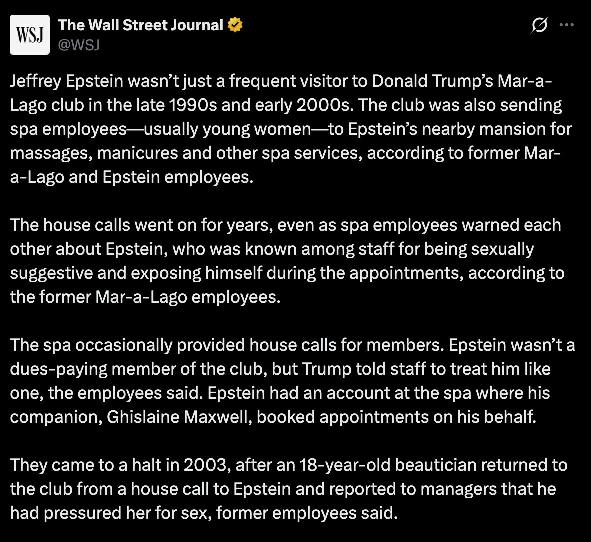 The Wall Street Journal has dropped reporting that doesn’t just poke holes in Trump’s story—it documents an operational system inside Trump’s own business that sent young women directly into Jeffrey Epstein’s orbit. Not socially. Not accidentally. At work. At Trump’s club. Under Trump’s authority.