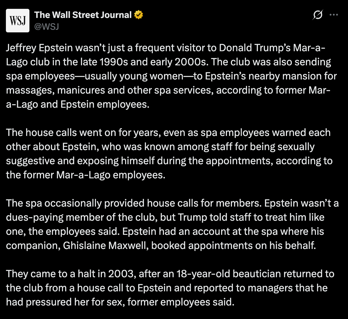 And still, the house calls continued. Trump kept sending young girls and women. Epstein abused and trafficked hundreds more. Until Epstein stole Virginia Guiffre from Trump, according to Trump, then it stopped (according to Trump):