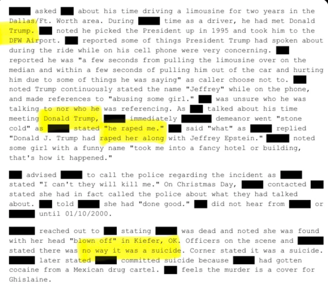 Buried inside FBI intake summaries are direct allegations describing Trump as an active participant in abuse alongside Jeffrey Epstein.