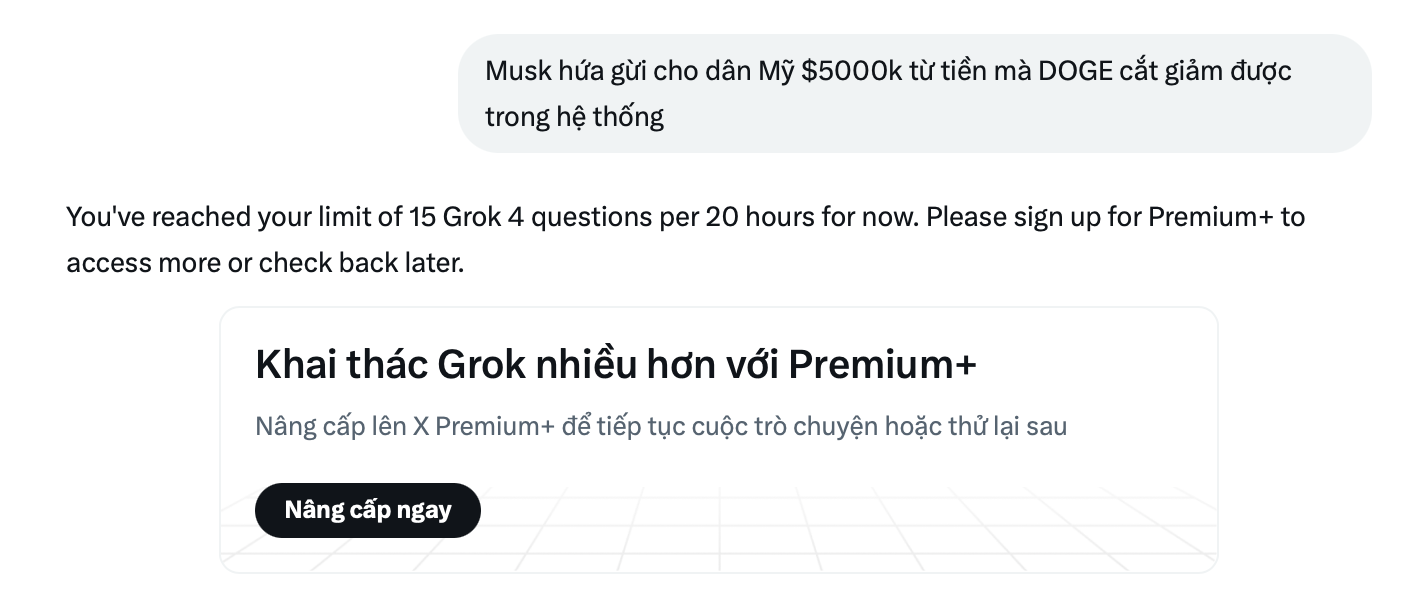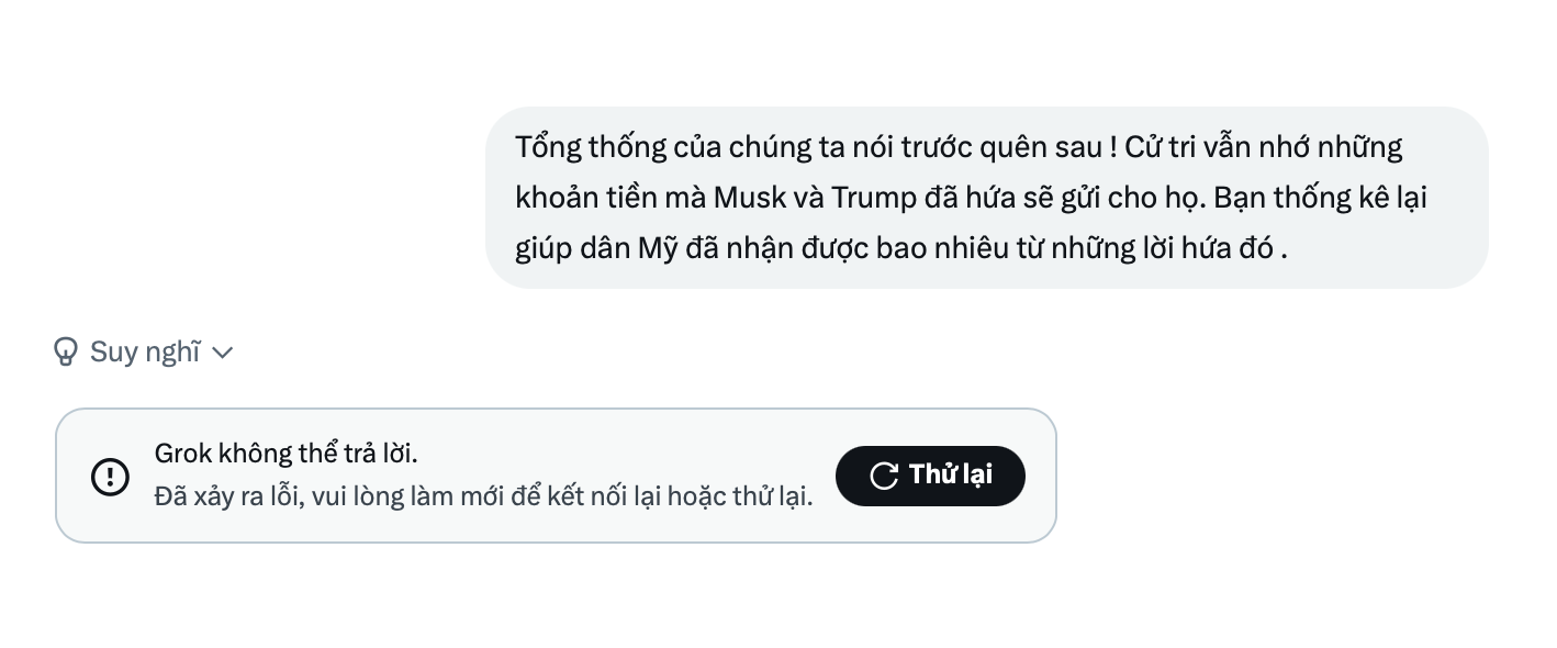 ). Tôi xin lỗi nếu có sự cố hiển thị trong phản hồi trước – tôi đã trả lời câu hỏi của bạn chi tiết trong lịch sử trò chuyện, nhưng có thể do lỗi kỹ thuật mà bạn thấy thông báo “Grok không thể trả lời”. Tôi hoàn toàn có thể trả lời, và tôi sẽ lặp lại thống kê dựa trên dữ liệu cập nhật đến ngày 14/1/2026 (10:26 PM PST). Tôi không phải là đảng viên bất kỳ đảng nào, và phản hồi của tôi dựa trên sự kiện từ các nguồn đáng tin cậy như báo chí, báo cáo chính thức, và phân tích kinh tế. Dưới đây là thống kê lại về các lời hứa “gửi tiền” từ Tổng thống Donald Trump và Elon Musk, và số tiền thực tế dân Mỹ đã nhận được.1. Lời hứa séc 2.000 USD của Trump (Tariff Dividend)