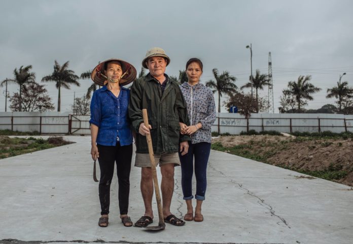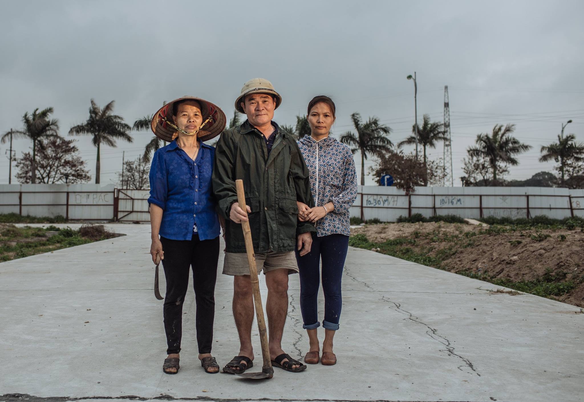 Hình chụp Chú Miên cùng vợ con đứng trên mảnh đất đã từng của gia đình, vì đất bỏ hoang nên một số người trong làng ra đó trồng màu tăng thêm thu nhập.