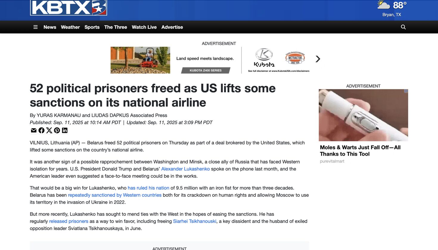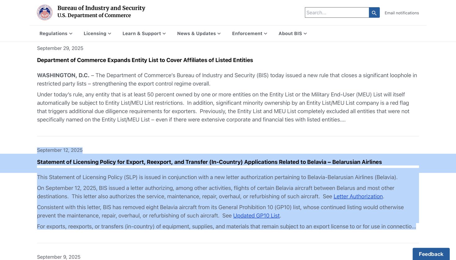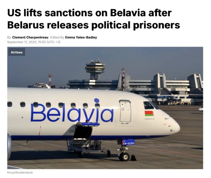 Nhưng song song với đó, ngày 11/9/2025, chính quyền Trump lặng lẽ ra quyết định dỡ bỏ lệnh trừng phạt Belavia — hãng hàng không quốc gia của Belarus, từng bị Mỹ cấm nhập phụ tùng máy bay và linh kiện liên quan đến công nghệ Mỹ. Lý do được công bố là do Belarus đã thả 52 tù nhân chính trị, nhưng thời điểm và mục tiêu của quyết định này gây ra nhiều nghi vấn.