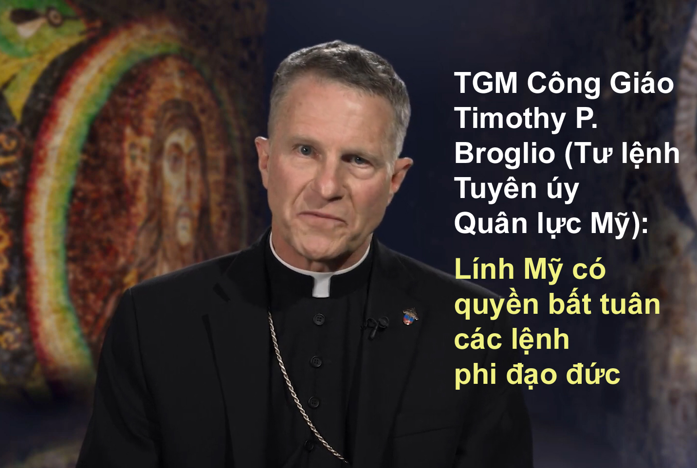 Khi được hỏi liệu ngài có “lo lắng” về các quân nhân dưới sự chăm sóc mục vụ của mình hay không, Broglio trả lời: “Tôi rõ ràng là lo lắng vì họ có thể bị đặt vào tình huống phải làm điều gì đó có vấn đề về mặt đạo đức.”