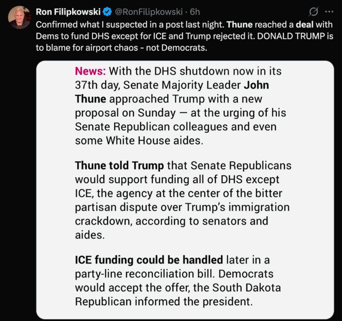 Theo đề xuất này, đảng Cộng hòa sẽ mở cửa lại toàn bộ Bộ An ninh Nội địa (DHS) ngoại trừ Cơ quan Thực thi Di trú và Hải quan (ICE), và xử lý riêng vấn đề tài trợ cho ICE thông qua một dự luật hòa giải theo đường lối đảng. Thune đã nói thẳng với Trump rằng đảng Dân chủ sẽ chấp nhận thỏa thuận này. Nhân viên TSA sẽ được trả lương. Tình trạng hỗn loạn ở sân bay sẽ chấm dứt. Cả hai đảng đều rút lui mà không hoàn toàn nhượng bộ.