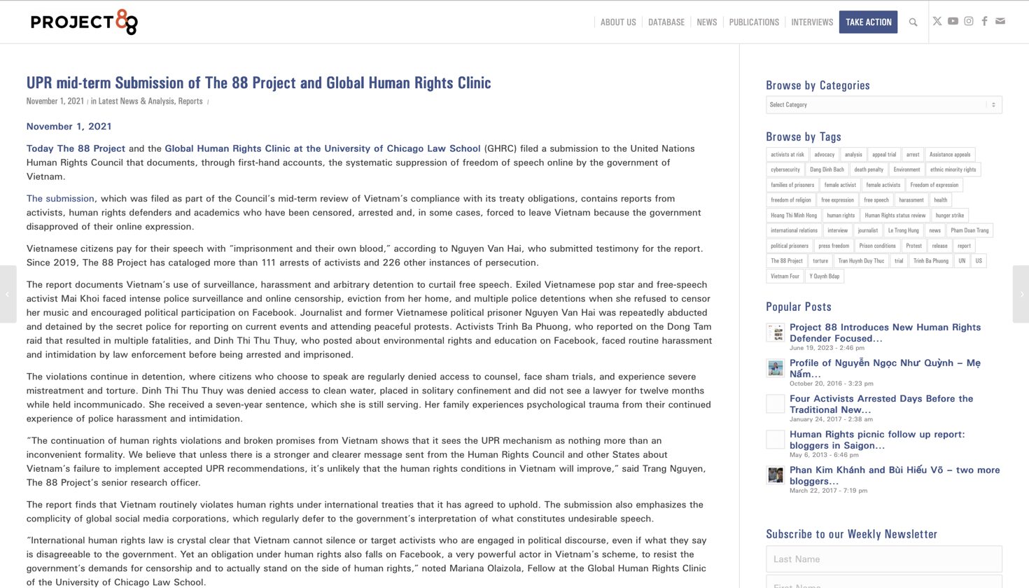 Ngày 1/11/2021, Dự án 88 và Phòng Thực hành Nhân quyền Toàn cầu (GHRC) của Đại học Chicago gửi lên Hội đồng Nhân quyền Liên Hợp Quốc bản báo cáo dày hơn 50 trang mô tả một thực tế mà họ gọi là:
