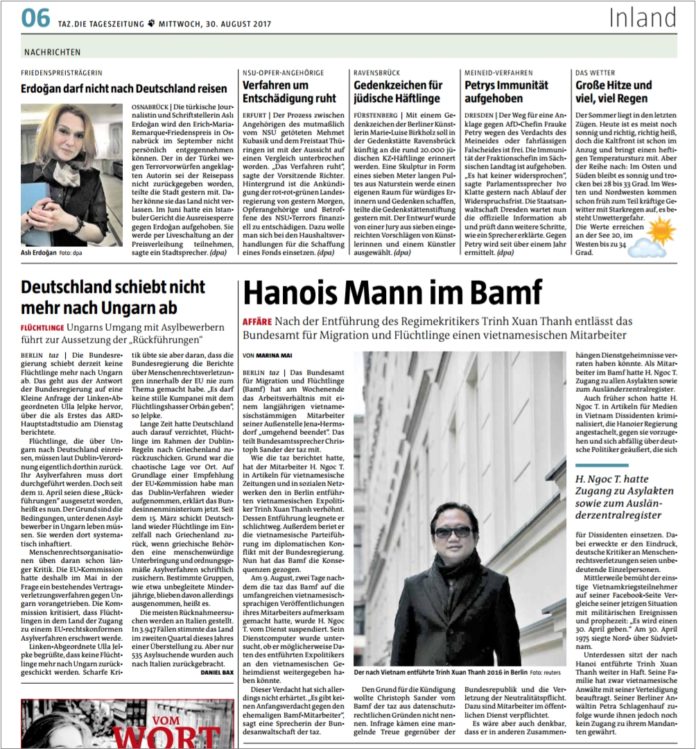 Nhật báo TAZ số ra hôm nay Thứ Tư ngày 30.08.2017 có đăng một bài báo chạy hàng tít lớn: “Người đàn ông của Hà Nội trong cơ quan BAMF“, và hàng tít nhỏ: “Sau vụ bắt cóc Trịnh Xuân Thanh -người chỉ trích nhà cầm quyền Việt Nam- cơ quan Liên bang Đức về nhập cư và tị nạn (BAMF) sa thải một nhân viên Việt Nam“.