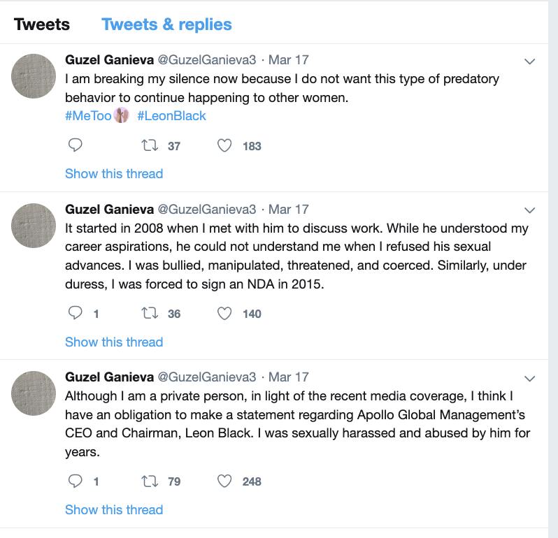 “I am breaking my silence now because I do not want this type of predatory behavior to continue happening to other women… I was sexually harassed and abused for years by Leon Black.”